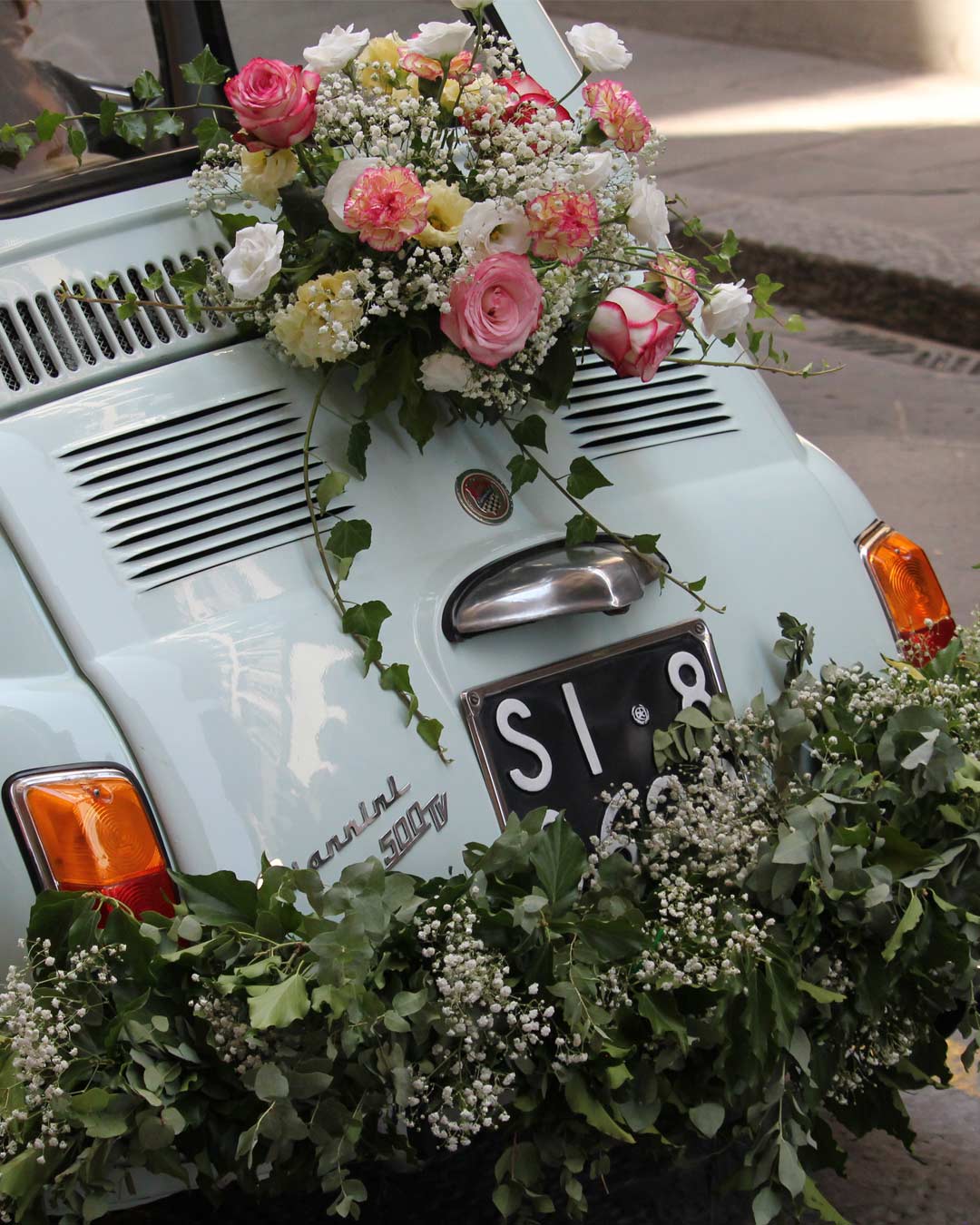 You may want something minimalistic yet elegant? Adorn the hood of your car with a single and colorful huge bouquet. You can also opt for a custom plate number or signage announcing your wedding. They’re assertive but not dominant, creating a level playing field for cars and decor to shine.